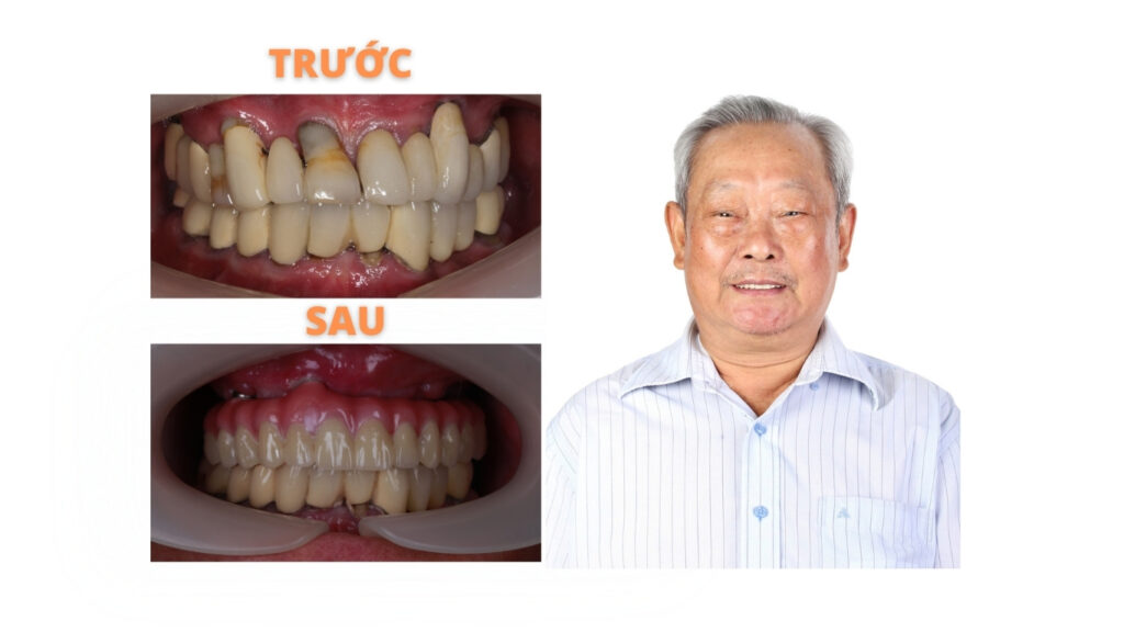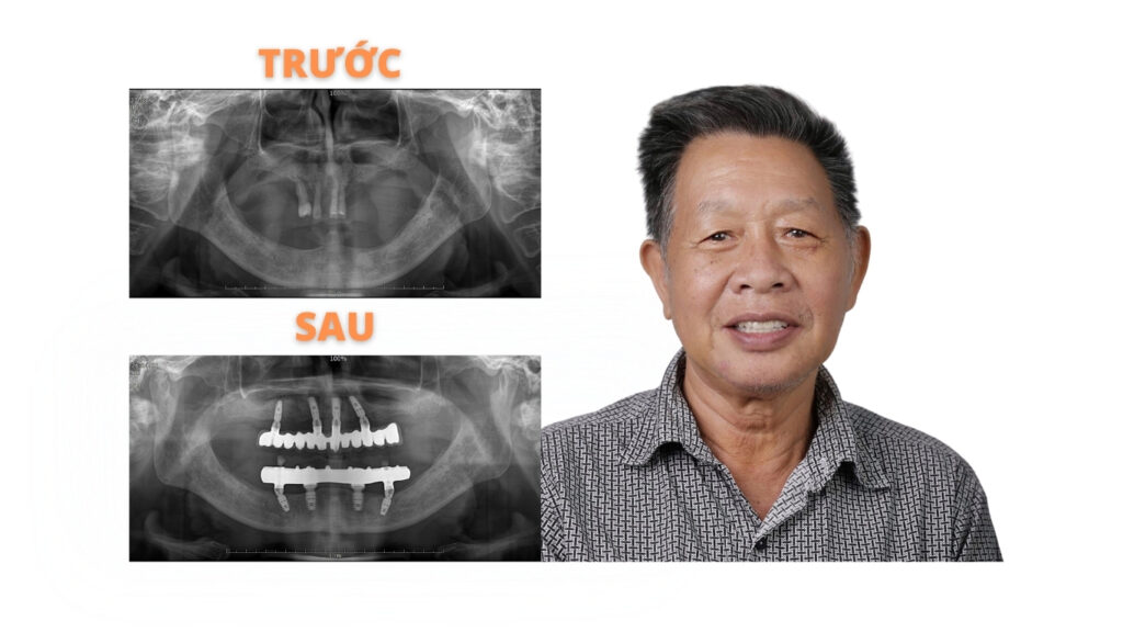 Chú đến Nha khoa Family với tình trạng mất toàn bộ răng hàm dưới và chỉ còn 4 răng cửa hàm trên, chú đã sử dụng hàm tháo lắp thời gian dài, điều này ảnh hưởng ăn uống sinh hoạt hàng ngày. Sau khi được thăm khám tư vấn kĩ bởi bác sĩ chuyên môn Cao Thành Trung- chuyên gia phẫu thuật- Implant tại nha khoa Family, Chú đã lựa chọn phương pháp cấy implant toàn hàm all on 4: hàm trên và hàm dưới. Và chú bây giờ có thể ăn ngon miệng. Chú đánh giá cao dịch vụ và bác sĩ tại Family Dental.