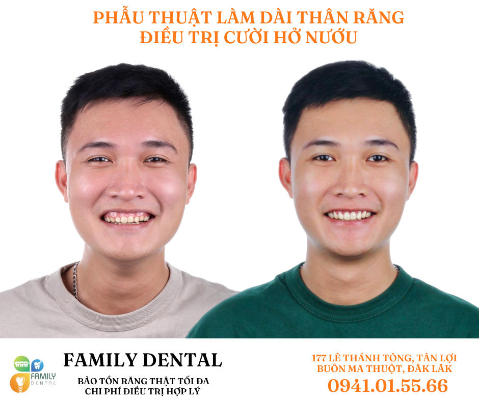 Với công nghệ tiên tiến và chuyên môn cao, Family Dental trở thành địa chỉ uy tín tại Đăk Lăk. Family Dental đã thực hiện thành công các ca phẫu thuật làm dài răng đem lại hàng nghìn nụ cười hoàn hảo cho khách hàng.
