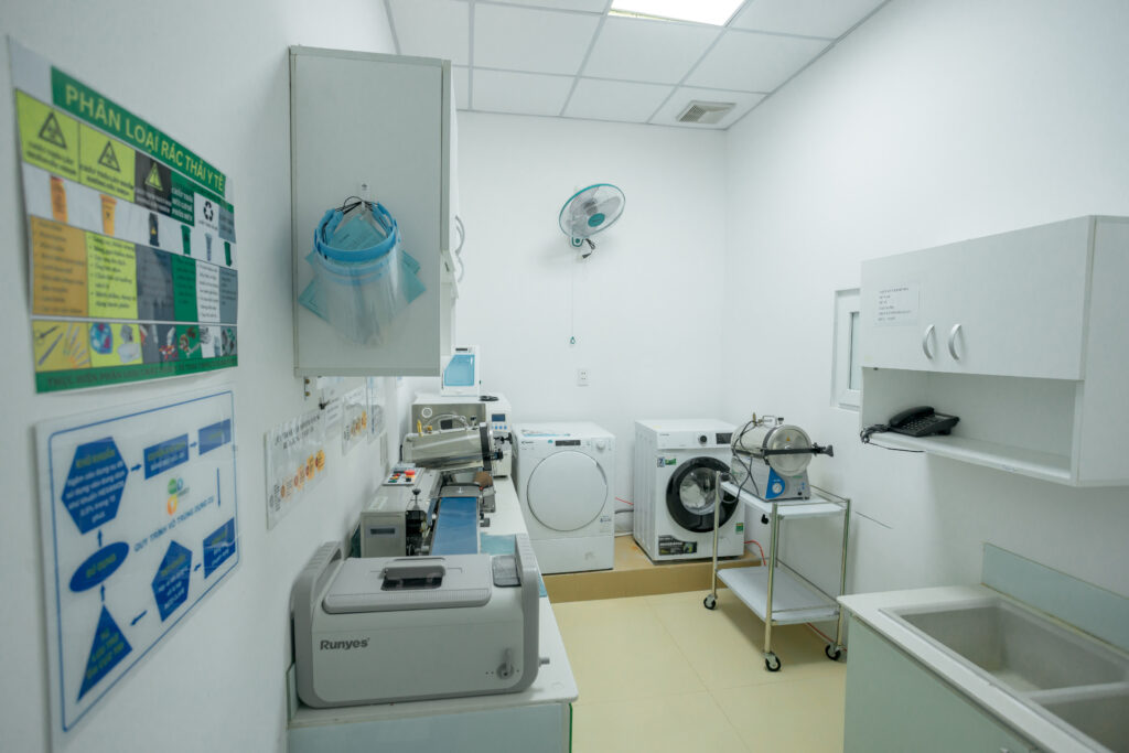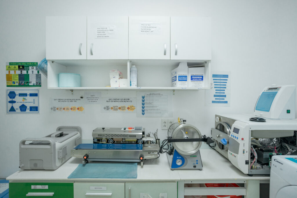 Phòng vô trùng sạch sẽ, đạt chuẩn y tế với hệ thống các máy tiệt trùng, lò hấp hiện đại giúp quá trình điều trị của bạn được đảm bảo an toàn sức khoẻ.