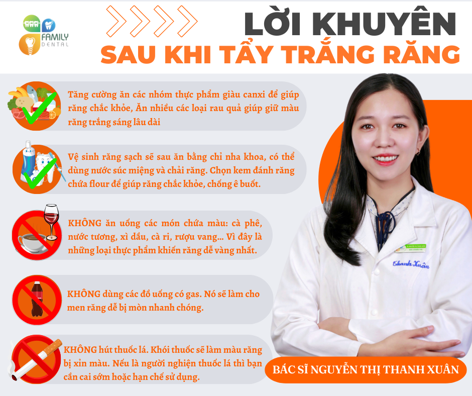 Hiệp hội Nha khoa Hoa Kỳ (ADA) khuyến nghị nếu bạn chọn tẩy trắng răng, bạn nên tham khảo ý kiến ​​bác sĩ trước, có thể đưa ra các lựa chọn làm trắng tốt nhất cho bạn và giám sát một kế hoạch điều trị để tránh các biến chứng.